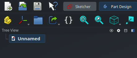 Objects are mainly created from the buttons in the main toolbar, or equivalently, from the menu at the top of the screen. Objects contained in the current document are listed in the Tree View on the left. Some objects can act as containers and contain other objects, which is why objects are displayed as a tree. This is only a visual way to represent a dependency though, sometimes the same object can be contained by multiple parents (such as a sketch shared by two different parts), in which case the same object will appear multiple times in the tree.