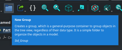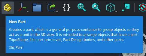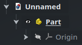 Objects also have an internal name. This internal name is assigned automatically when the object is created and cannot be modified. It is used internally in the dependencies between objects in order to reference them uniquely in a way that won’t break when objects are renamed. This is rarely necessary, but in case you need to find the internal name of an object, you can either have them shown in the Tree View by right clicking on it and checking Tree Settings > Show Internal Names, or by hovering over the object and looking at the status bar at the bottom of the screen (if it is not displayed, make sure View > Status bar is enabled in the menu at the top of the screen). Here, the label is “My Part” and the internal name is “Part” (the next one would be called Part001, and so on).