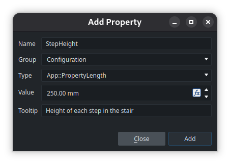 It is even possible to create custom properties on objects, that can be used to expose some parameters whose values are used in expressions inside the object. To add a custom property on an object, simply go to its Property View, then right-click anywhere and chose Add Property. For instance, let’s say you have modeled a staircase for your house. You could add a custom “StepHeight” property on that Part, that you could then use as a parametric variable in expressions for sketch dimensions or extrusions lengths :