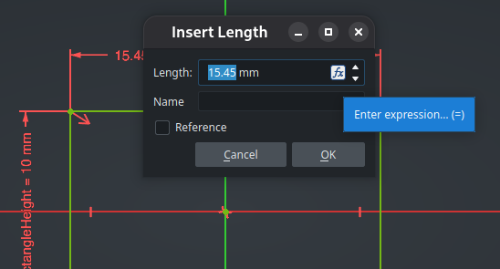 Now, add an horizontal dimension on the line at the top, then either click on the Fx icon at the right of the Length value or simply type “=” to open the Expression Editor :