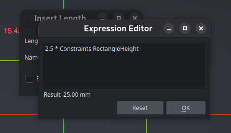 Here, we need to write an expression for the width dimension that references the height dimension and multiplies it by 2.5. Dimensions are a kind of constraint, and constraints are grouped in the Constraints property of our current sketch. Inside this property, we can access a constraint either by its internal name, or more easily by the custom name we have given it. And since we are inside the sketch, we can access its properties directly without naming the sketch object explicitely. We can therefore write this expression :