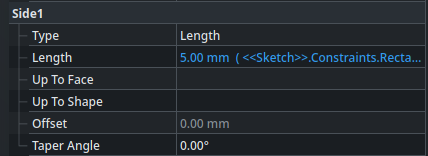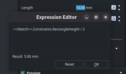 We can now close the sketch, then create a Pad operation whose Length property is (as specified by the arbitrary requirement that we decided earlier), half the height of the rectangle. This works exactly the same way, by typing “=” while the cursor is on the Length input (or clicking on the Fx icon). The only difference is that, since we are now outside the sketch (we are in the context of the Pad object), we need to reference it explicitly in order to access its constraints. Here is the expression we need :