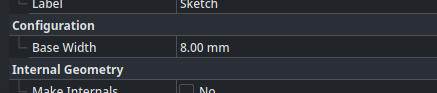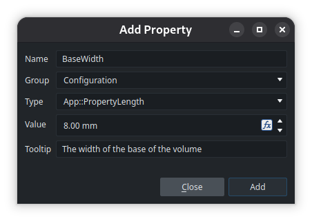 Let’s do this. Select the sketch in the Tree View, then right click anywhere in its Property View and select Add Property from the contextual menu. In the dialog, set the name to “BaseWidth“, the group to “Configuration” (it doesn’t exist in the list, but we can type it directly, it will be automatically created), and the type to “App::PropertyLength” (since this property represents a dimension). Let’s also set the default value to 8.0 mm for example, and we can also chose a tooltip to describe the purpose of this property if we want.