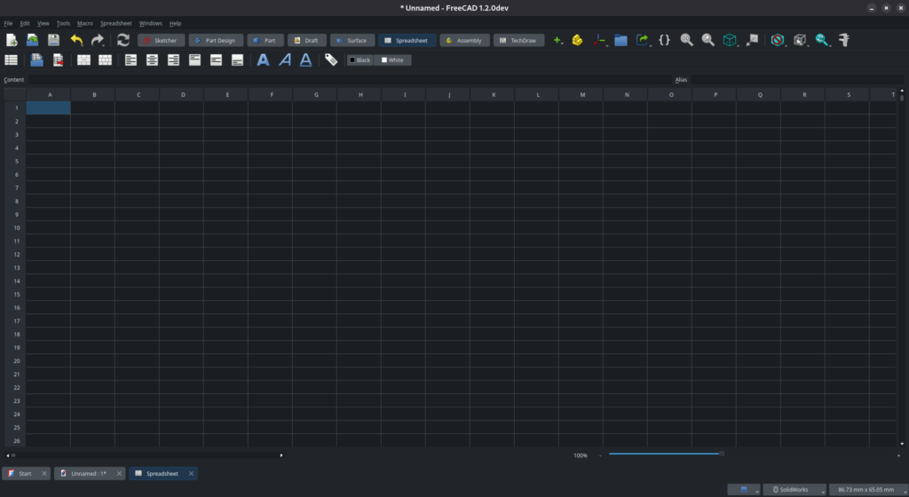 FreeCAD offers another object that you can use to store data : spreadsheets. As you might expect, a spreadsheet looks like what you might find in LibreOffice Calc or Microsoft Excel, and has more advanced features than VarSets — although they are not as powerful as those dedicated software, obviously.