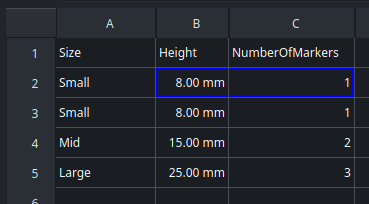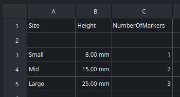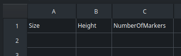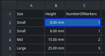 In the spreadsheet, we need to put the variants as rows, and the variables as columns. We start by adding a header — it’s just for us, to define what each column means. The first column will be the name of the size variant, the second column will be the height of the rectangle (which, after what we configured since the beginning of this post, drives all other dimensions through expressions), and the third will be the number of markers.