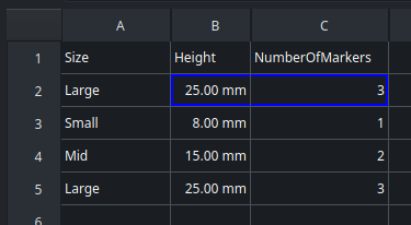 The better way is to use an alias. An alias is a name given to particular cell in a Spreadsheet, which must be unique in the scope of that spreadsheet. To set an alias on the selected cell, either specify it in the Alias input box at the top right of the spreadsheet, or right-click on the cell, open its Properties panel, and go to the Alias tab. Here, we’ll set the aliases “Height” and “NumberOfMarkers” on the cells B2 and C2 respectively. Any cell which has an alias is shown with a blue background :
