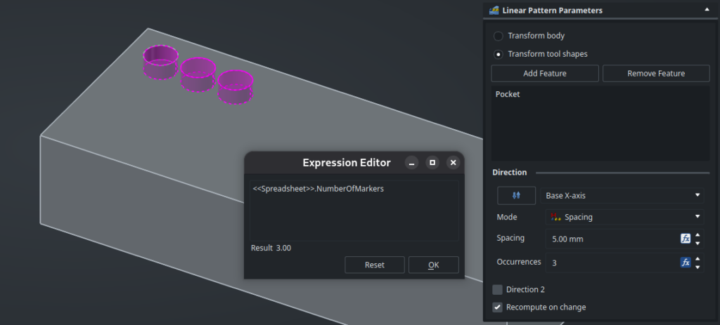 Finally, we can add a pocket feature on the current part, then a Linear Pattern function, and drive its number of occurrences with the NumberOfMarkers parameter from the spreadsheet :